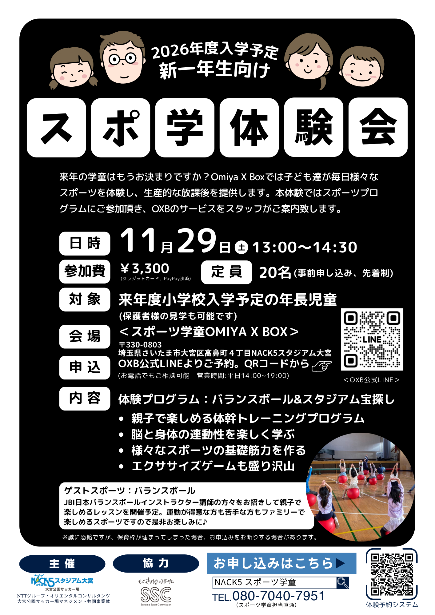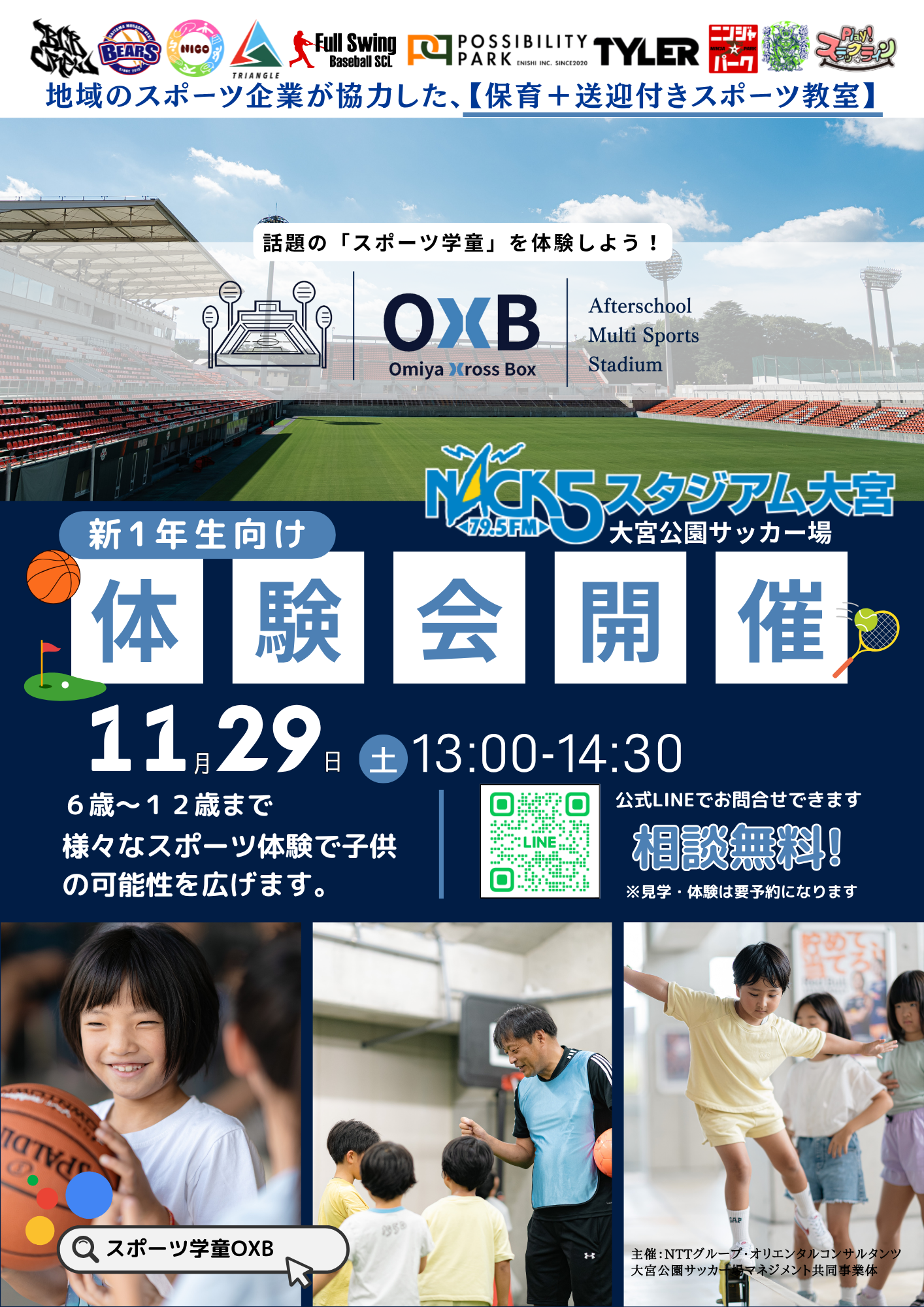 NACK5スタジアム大宮では、2026年度に小学校へ入学予定のお子さまを対象に、スポーツ学童「Omiya X Box(OXB)」による体験イベント「スポ学体験会」を実施いたします。